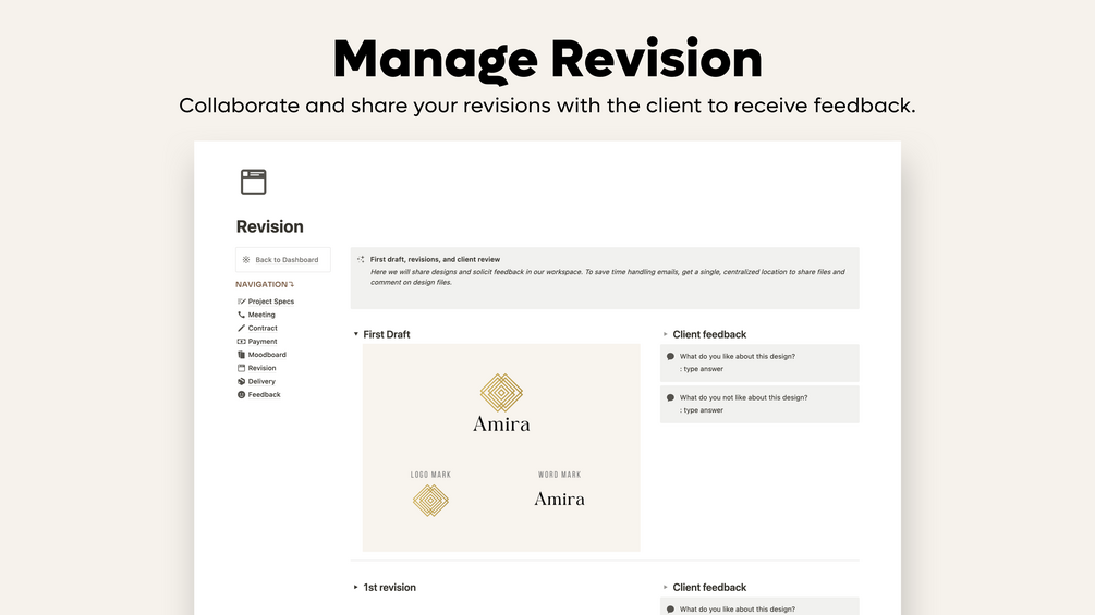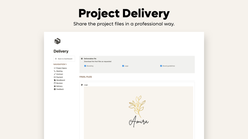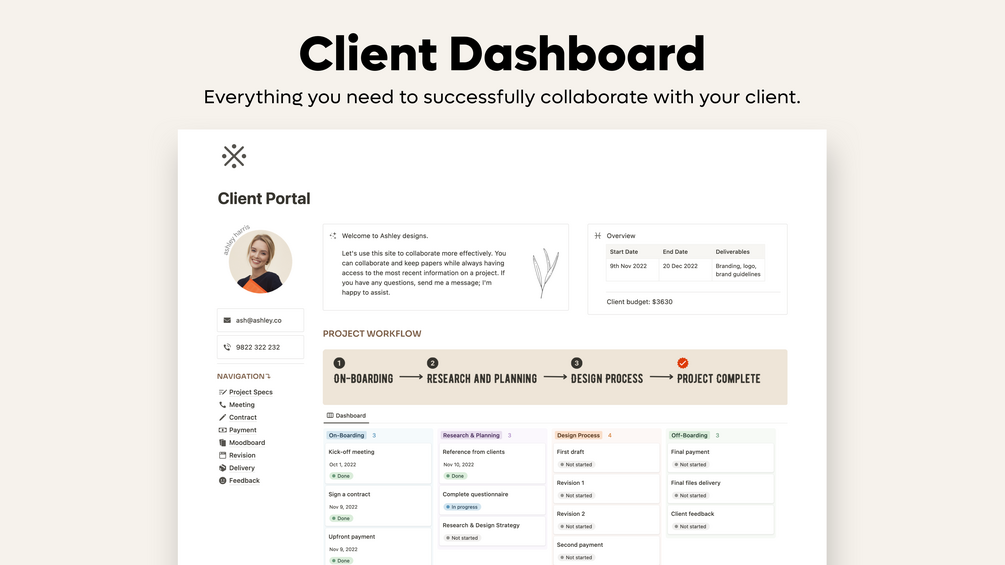 As freelancers, we focus on the client experience because we care. And we want our customers to love working with us. Notion client template empowers you to create fully customizable, lovable client experiences that you're proud to put your name and brand on.